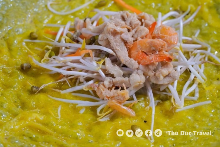 Phần nhân bánh mang đậm hương vị miền quê An Giang. Tôm đồng tươi, thịt ba chỉ cắt lát vừa ăn, giá đỗ trắng giòn được cho vào đầy đặn nhưng không quá nhiều, giữ trọn vị ngọt tự nhiên. Nhân bánh không cầu kỳ, nhưng chính sự mộc mạc ấy lại làm nổi bật cái ngon thuần khiết của từng nguyên liệu.