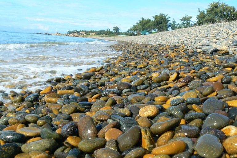 Bãi đá dưới chân chùa Cổ Thạch còn có tên khác là bãi Cà Dược. Những viên đá cuội ở đây nhẵn thín, nhiều màu sắc và trải dài hơn một km. Thủy triều cùng những con sóng hàng nghìn năm đã mài nhẵn các viên đá cuội với vô số hình hài, hoa văn lạ lẫm.