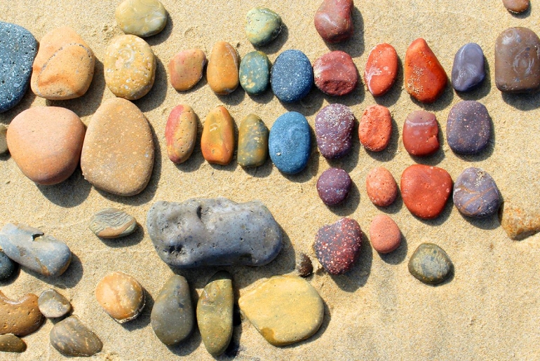 Dưới ánh mặt trời và bọt sóng, cả một bờ biển như một tấm khảm khổng lồ lấp lánh sinh động.