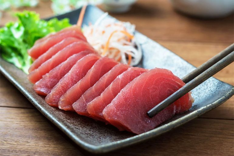 - Sashimi cá ngừ đại dương: Từng thớ thịt của cá sẽ được đầu bếp thái mỏng đặt ngay ngắn trên từng đĩa ăn để ăn sống. Cuộn miếng sashimi cá ngừ vào lá cải và tía tô, cho 1 ít rau kèm là cà rốt và củ cải trắng thái mỏng chấm vào chén tương pha với mù tạt.