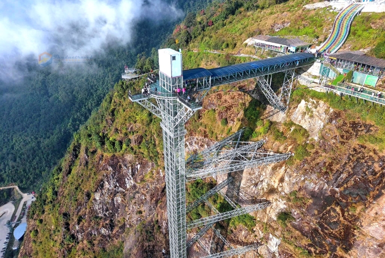 Công trình cầu kính Rồng Mây được xây dựng bao gồm phần lối đi dẫn vào bắt đầu từ lòng núi và sau đó lên hệ thống thang máy dài 70m cheo leo, thang máy sẽ đưa du khách lên vị trí của cầu kính cao 2.200m so với mực nước biển và mặt cầu cách vách núi 60m tạo cảm giác như lơ lửng giữa không trung. Buồng thang máy có sức chứa 30 khách/ lượt với bốn mặt kính để du khách thỏa sức ngắm cảnh.