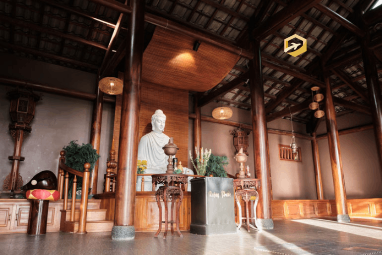 Kiến trúc bên trong ngôi chùa hoàn toàn được làm bằng vật liệu gỗ và được thiết kế theo lối kiến trúc truyền thống kết cấu hình giá chiêng vững chãi, hệ thống cột trụ đều tăm tắp. Nền được lát đá phẳng mịn sạch sẽ tạo cảm giác mát lạnh. Đồ đạc trong chùa rất đơn sơ, trang trí không có nhiều, chính giữa gian chùa đặt tượng Đức Phật tạc bằng đá trắng. Xung quanh bài trí một số đồ vật đơn giản, lọ hoa thờ, mõ, chiêng đồng, phía trên che bức mành thưa như một tấm lọng.