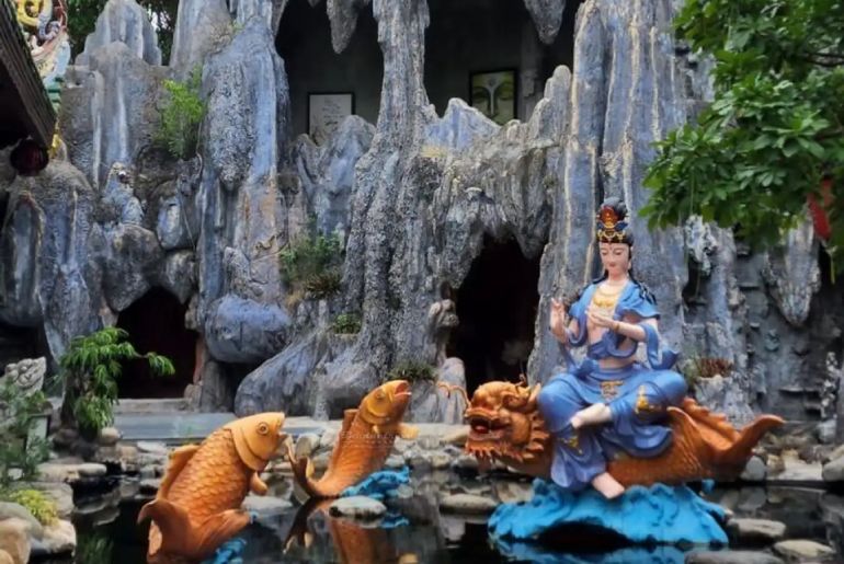 - Có rất nhiều tượng Phật để bạn có thể ghé tham quan và đảnh lễ. Trong đó, nổi bật nhất phải kể đến Bức tượng Nam Hải Linh Ứng Quan Âm màu xanh nửa chìm nửa nổi trong hồ nước được đặt tại khuôn viên chùa vô cùng bắt mắt và ấn tượng với chiều cao 2,2m và nặng 74kg.