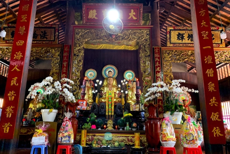 Chánh điện có diện tích khá khiêm tốn nhưng lưu giữ nhiều hiện vật có giá trị, ý nghĩa về lịch sử, văn hóa, nghệ thuật qua các cột kiểu tứ tượng ở chánh điện, những tượng Phật có từ đầu thế kỷ XIX và các hoành phi câu đối chữ Hán sơn son thiếp vàng.