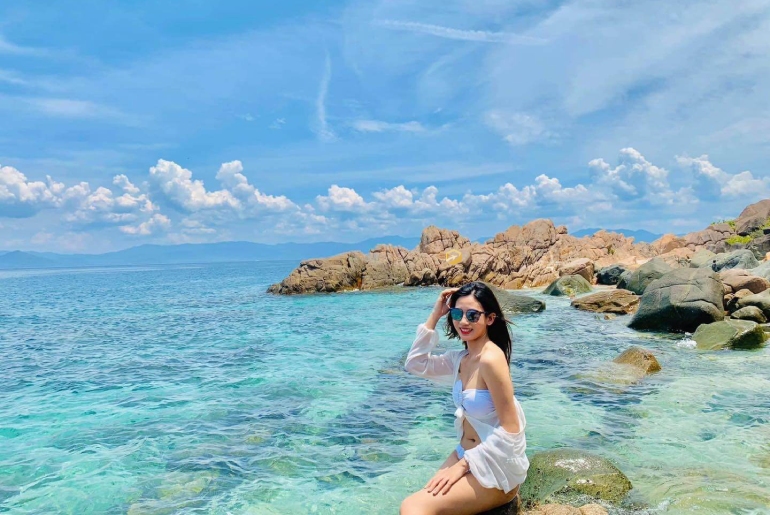 Dù nằm trên Đảo Bình Hưng nhưng muốn đến bãi Cây Me thì cần phải đi bằng tàu vì ở đây không có đường đi bộ đến bãi. Bạn có thể tha hồ check-in với tảng đá ở ở giữa bãi, với làn nước trong xanh giống như nước hồ bơi, trong đến mức 5m vẫn có thể nhìn thấy đáy đó.
