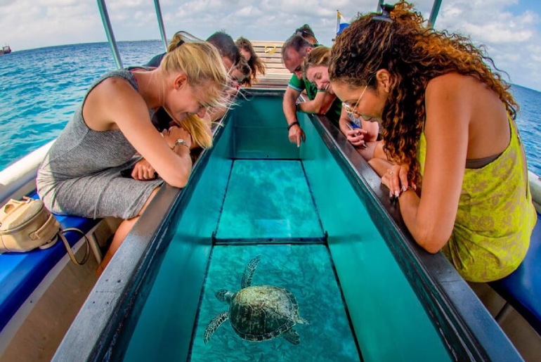 Nếu đến đảo Hòn Mun nhưng không đủ sức khỏe để tham gia lặn biển hoặc không thực sự thích đắm mình xuống đáy biển thì bạn có thể lựa chọn ngắm biển bằng tàu đáy kính. Tàu có hình tròn giống như một chiếc thuyền thúng nhưng lại có lớp kính ở dưới đáy nên du khách có thể thỏa sức ngắm nhìn những rạn san hô hay các loài cá, sinh vật biển tại đây.
