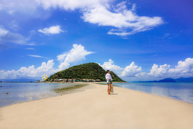 Tại đây có một con đường cát ẩn sâu dưới dòng nước biển nối từ đất liền qua đảo, đường đi sẽ hiện lên tùy vào thủy triều, thông thường thì từ mùng 1 đến 15 Âm lịch thì thủy triều sẽ rút vào buổi chiều, còn từ mùng 15 đến cuối tháng Âm lịch thì thủy triều sẽ rút vào buổi sáng.