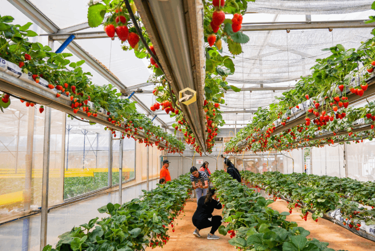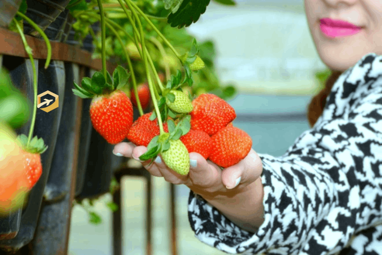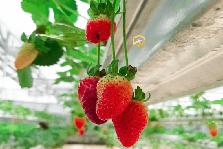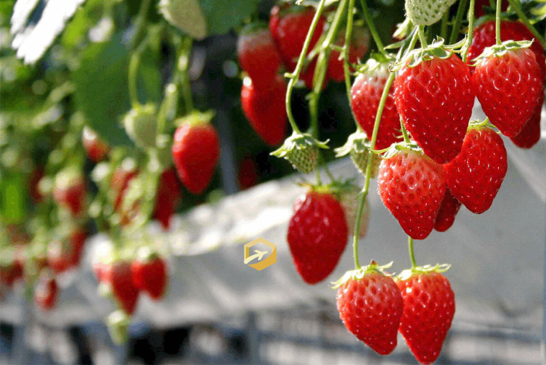Đặc điểm: Dâu Tây ở đây được trồng theo công nghệ thủy canh trên giàn, tất cả quá trình chăm sóc dâu đều được tự động hóa và không sử dụng bất kỳ loại thuốc bảo vệ thực vật nào.
