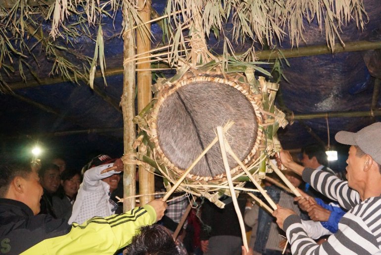 Sau khi kết thúc nghi lễ, già làng sẽ đánh một tiếng trống lớn mở màn phần hội. Lúc này, mọi người cùng quây quần với nhau bên những ché rượu hiên. Các anh thanh niên lực lưỡng thì thi nhau tranh dùi đánh trống. Tiếng trống là hiện thân của tiếng nói thần kỳ, linh thiêng như tiếng của người Ma Coong bất khuất vang dội khắp đại ngàn Trường Sơn. Trước khi trời sáng, trống phải được đánh sao cho thủng mới thôi. Điều này tượng trưng cho tấm lòng chân thành của người dân Ma Coong mong ước một năm mùa màng bội thu.