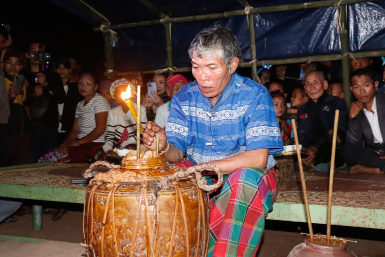 Khi trăng lên ngửa đầu cũng chính là lúc khai lễ. Vị già làng sẽ đọc lời khấn cầu thần linh phù hộ cho bản làng Cà Roòng được yên bình, trẻ nhỏ không còn ốm đau bệnh tật, công việc làm ăn được thuận lợi, vụ mùa bội thu… Khi hành lễ xong, thóc sẽ được ném ra bốn phía xung quanh với niềm mong ước lúa thóc sẽ về đầy bồ, đầy nương.