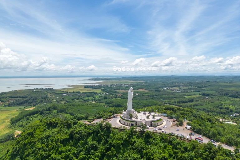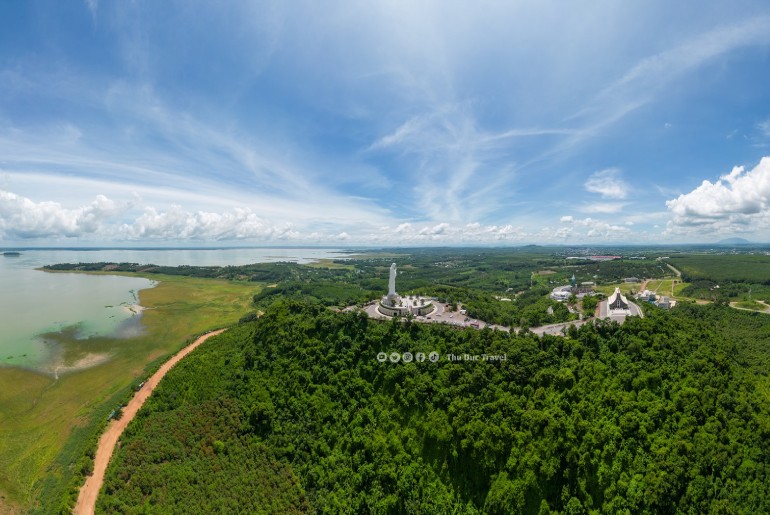 Nơi uy nghi lộng lẫy trên đỉnh đồi, xung quanh là khung cảnh thiên nhiên hài hoà, hùng vĩ và được bao bọc bởi lòng Hồ Trị An rộng lớn. Kế bên là rừng cây cao su xanh ngát, tạo cho nơi đây có một không khí mát mẻ và trong lành, con người sẽ cảm thấy gần gũi với thiên nhiên.