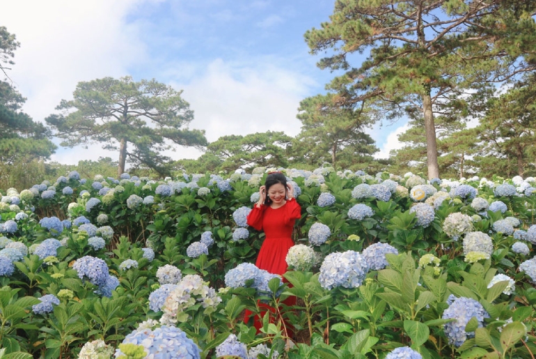 Nằm xen kẽ trên Đồi thông Hai Mộ đó là các vườn ươm với đủ các loại hoa trong đó nổi bật nhất là vẻ đẹp của loài hoa cẩm tú cầu. Buổi sáng hoa có màu trắng ngà, nhuộm ướt sương mai tạo nên vẻ đẹp vô cùng mong manh. Buổi chiều đồi hoa lại có vẻ đầy sức sống dưới ánh nắng vàng. Ngoài ra, bạn cũng có thể ngắm những vườn hoa rặng sim tím, hoa dã quỳ và hoa oải hương… Hoa nào cũng đều có vẻ đẹp riêng biệt.