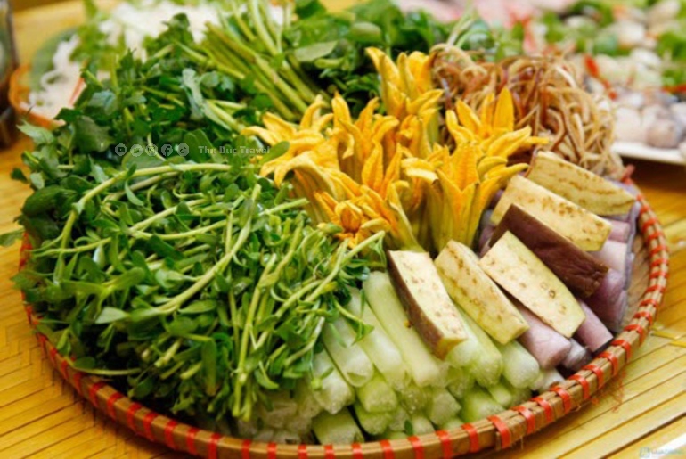 Một yếu tố không thể thiếu trong bữa lẩu mắm chính là đĩa rau ăn kèm đa dạng. Ngọn rau dừa non, bông súng giòn ngọt, rau muống, rau đắng, rau om, ngò gai thơm nồng, đọt nhãn lồng, bông so đũa, cà phổi, bắp chuối tươi... tất cả đều là những loại rau đồng đặc trưng mà chỉ vùng sông nước miền Tây mới có. Chính sự đa dạng này đã tạo nên "thiên đường rau" độc nhất vô nhị, giúp cân bằng vị đậm đà của nước mắm và mang đến trải nghiệm ẩm thực trọn vẹn.