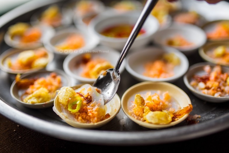 Bánh bèo chén ở đây với lớp bánh mềm mịn từ bột gạo, phủ đầy nhân tôm cháy, mỡ hành thơm phức và đậu phộng giã bùi bùi, hòa quyện với nước mắm pha vừa vị! Sự kết hợp giữa ngọt, bùi, mặn mà tạo nên hương vị khó cưỡng - ăn một lần là nhớ mãi đấy!