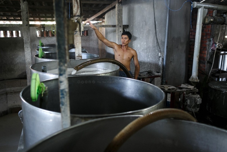 Sau vài giờ ngâm, hỗn hợp từ từ biến đổi: tạp chất và phụ phẩm chìm xuống đáy bể, trong khi phần tinh bột thuần khiết nổi lên trên. Tùy cách làm của mỗi lò ở công đoạn này mà chất lượng thành phẩm sẽ khác biệt.