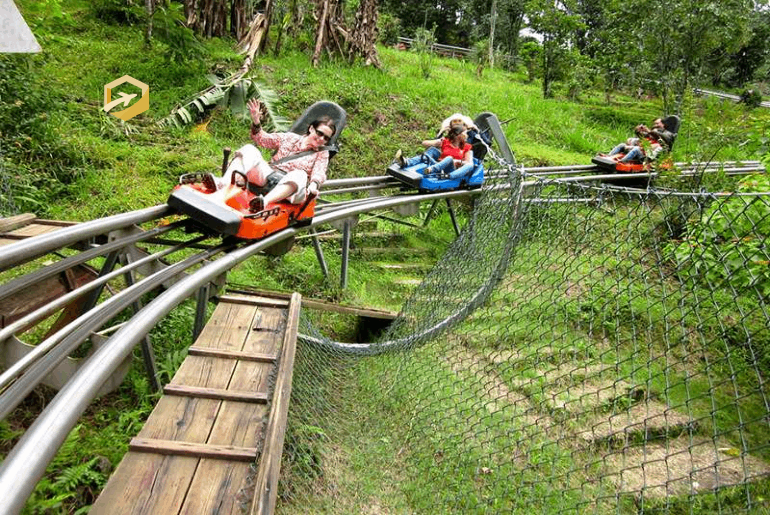 Nếu muốn cảm giác mạnh, du khách đừng ngần ngại thử sức với thử thách vượt cầu treo để tiến đến khu trò chơi dân gian hay khu cảnh quan thiên nhiên. Cầu không quá dài, nhưng để vượt qua nó cũng không phải dễ dàng. Ngoài tham quan và ngắm cảnh, du khách cùng gia đình có thể dừng chân nghỉ mệt ở các vách núi hoặc vào các chòi cho thuê để thưởng thức đặc sản cơm lam ăn cùng gà nướng thơm phức nơi đây. Một sự lựa chọn khác cho những bạn trẻ năng động là tham gia trò chơi đạp vịt trên hồ Đambri.