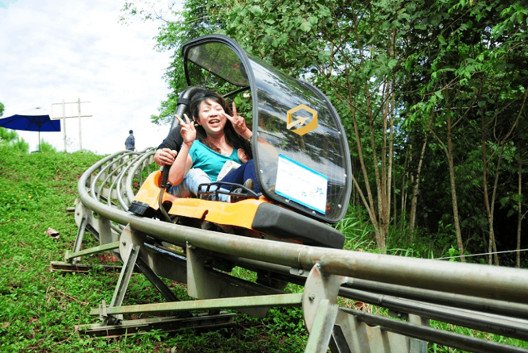 Các bậc thang không dẫn khách trực tiếp xuống thác mà rẽ du khách theo con đường giữa lưng chừng núi, tạo điều kiện cho khách được thỏa thích chiêm ngưỡng cảnh thác nước và hồ từ trên cao cũng như dẫn khách vào động Phật Bà. Từ điểm này phóng tầm mắt nhìn ra, du khách có thể bao quát được cảnh thác nước chảy cuồn cuộn, bọt tung trắng xóa cả một khoảng mây trời. Đến với ngọn thác cao hơn 60m này, du khách còn được trải nghiệm khám phá ống trượt nước dài nhất Việt Nam với độ dài tổng cộng là 1650m.