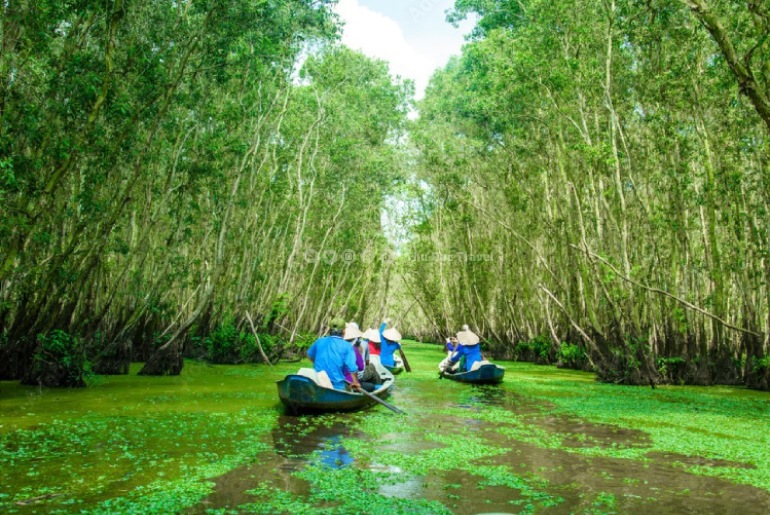 Bạn sẽ có dịp ngồi trên xuồng (tắc ráng) len lỏi dọc theo những dòng kênh xanh mát, ngắm nhìn đủ loài chim bay lượn tìm mồi, cất tiếng gọi bầy huyên náo cả không gian. Từng đàn chim cả trăm con sải cánh tạo nên một cảnh tượng thanh bình quyến rũ.