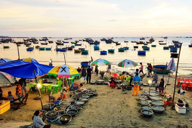 Đến với Làng chài Mũi Né Phan Thiết, các bạn không chỉ được hòa mình vào những bãi biển mát mẻ mà còn được khám phá cuộc sống của người dân ở đây. Làng chài vào buổi sáng giống như một khu chợ trên biển với nhiều tàu bè chở nhiều loại cá, mực, tôm,… vừa đánh bắt được để đem ra chợ bán. Những cuộc trao đổi này diễn ra hằng ngày, lúc đầu nhìn vào các bạn sẽ nghĩ đó là một lễ hội biển nào đó đang diễn ra nhộn nhịp.